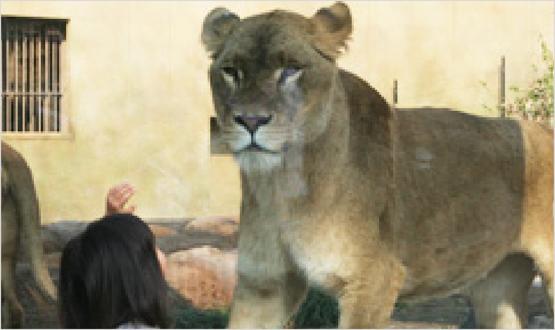 ライオンのテリトリーに潜入できるトンネルをつくり、トンネルでは、肉に喰らいつく野性味あふれるライオンの姿を、ライオンの目線で見ることが出来ます。