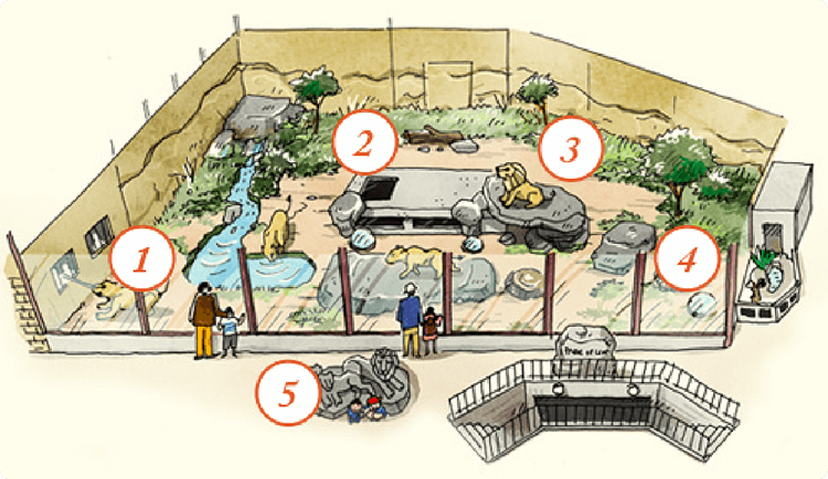 ライオンのテリトリーに潜入できるトンネルをつくり、トンネルでは、肉に喰らいつく野性味あふれるライオンの姿を、ライオンの目線で見ることが出来ます。